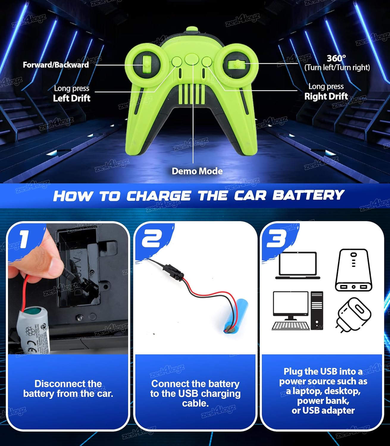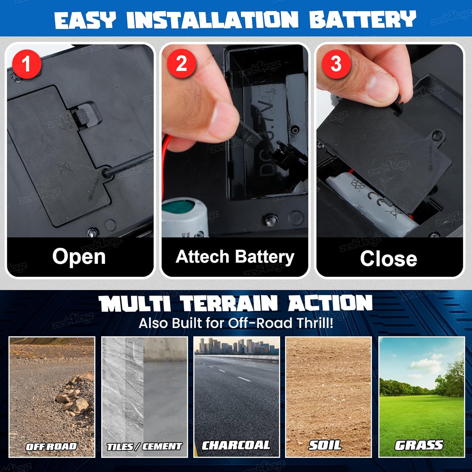 - 🚙 Off-Road Ready – Large off-road wheels and drift tyres ensure amazing speed, grip, and stable performance on any surface - carpet, tiles, or outdoor terrain.